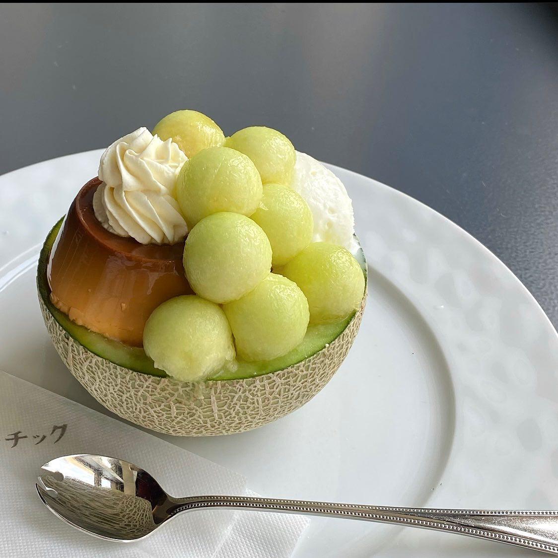 【メニューのご紹介】 数量限定"メロンのまるごとプリンアラモード" 瑞々しく上品な甘さと香りの旬のメロンを、存分に味わっていただけるよう半分まるごと使用。 ブーチック自慢の自家製プリンやメロンはもちろん、塩ミルクアイスやホワイトチョコムースなどのマリアージュを楽しんでいただける、とっても贅沢なプリンアラモードになっております!