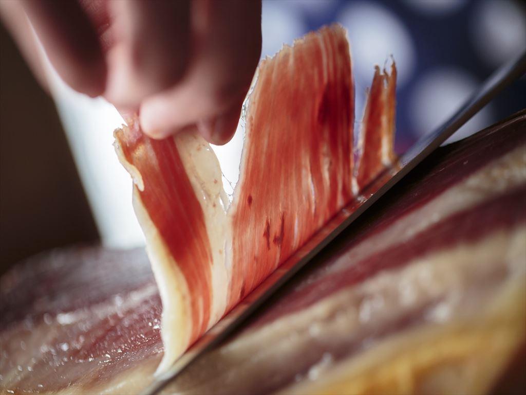 バルマル西梅田で取り扱っている生ハムは、スペインのイベリコ豚生ハムの中でも最高級の“ベジョータ”。 脂の旨みが違います!こちらを手切りでカット。大人気です。 生ハムは、もう1種類、イタリア・パルマ産の生ハムもご用意。こちらは、イタリア製の手作り生ハム台でカットします。 切りたて生ハムは、大人気。