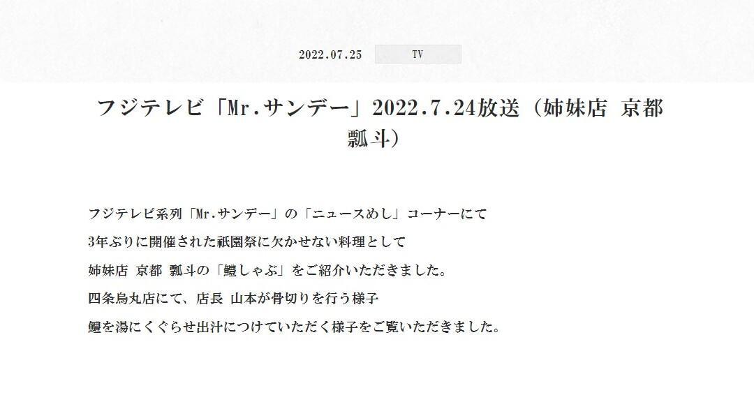 【フジテレビ「Mr.サンデー」でご紹介いただきました!】 2022年7月24日(日)放送のフジテレビ「Mr.サンデー」で、瓢斗 京都四条烏丸店の「鱧(ハモ)しゃぶ」を取り上げていただきました。 3年ぶりに開催され、「鱧祭り」とも呼ばれる京都の「祇園祭(ぎおんまつり)」の特集に登場。梅雨明けに旬を迎える鱧は夏の京料理の定番で、「骨切り」の音は夏の風物詩と言われています。 そんな季節の移り変わりを感じることができるのも、mihakuで働く魅力のひとつなんですよ。