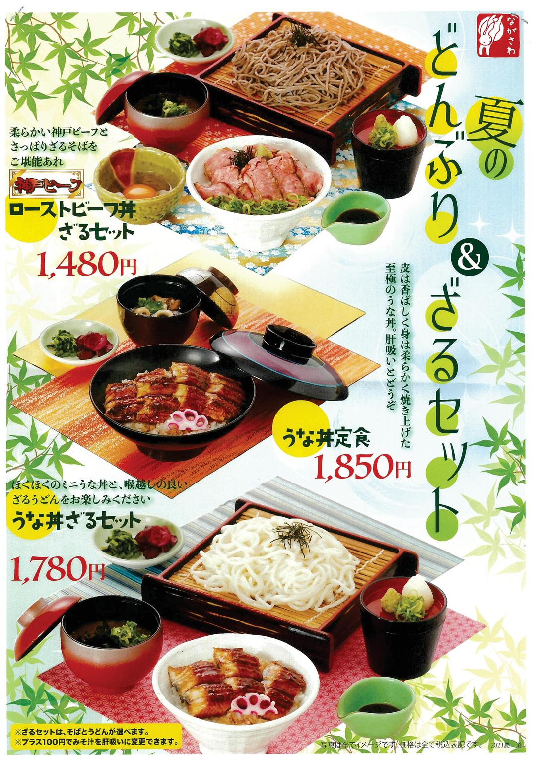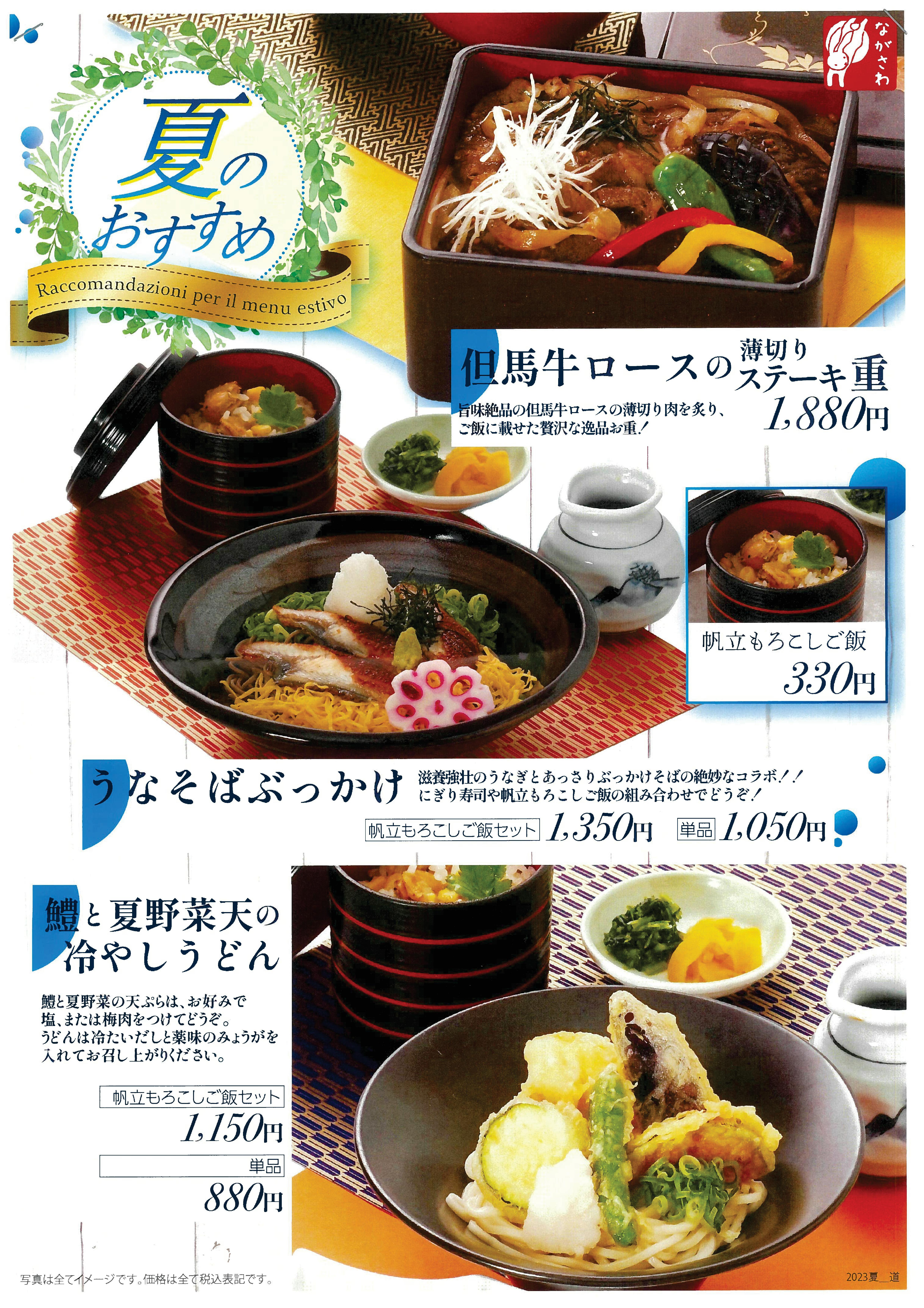 道の駅みき店の夏のおすすめメニューです。 但馬牛の薄切りステーキ重、うなそばぶっかけうどん、鱧と夏野菜の冷やしうどんなど 自慢のメニューが揃いました。夏のにぎり寿司や帆立もろこしご飯などと一緒に是非お召し上がりください。