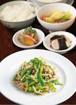 白碗ランチ御膳いろいろ選べる主菜、『 豚肉といろいろキノコの唐辛子ピリ辛醤油炒め』です。 毎日かわる小菜二品、ライス&スープ、デザート付きです。