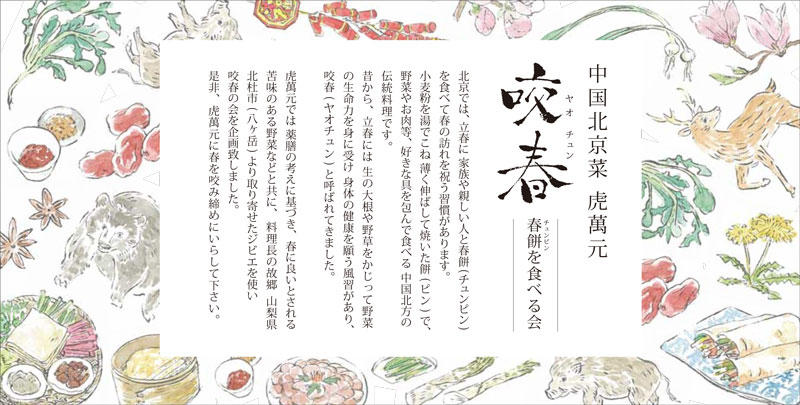 北京では、立春に 家族や親しい人と春餅(チュンピン) を食べて春の訪れを祝う習慣があります。 小麦粉を湯でこね 薄く伸ばして焼いた餅(ピン)で、 野菜やお肉等、 好きな具を包んで食べる 中国北方の伝統料理です。 昔から、立春には生の大根や野草をかじって野菜の生命力を身に受け 身体の健康を願う風習があり、咬春(ヤオチュン)と呼ばれてきました。 虎萬元では 薬膳の考えに基づき、春に良いとされる苦味のある野菜などと共に、 料理長の故郷山梨県北杜市(八ヶ岳)より取り寄せたジビエを使い咬春(ヤオチュン) 咬春の会を企画致しました。