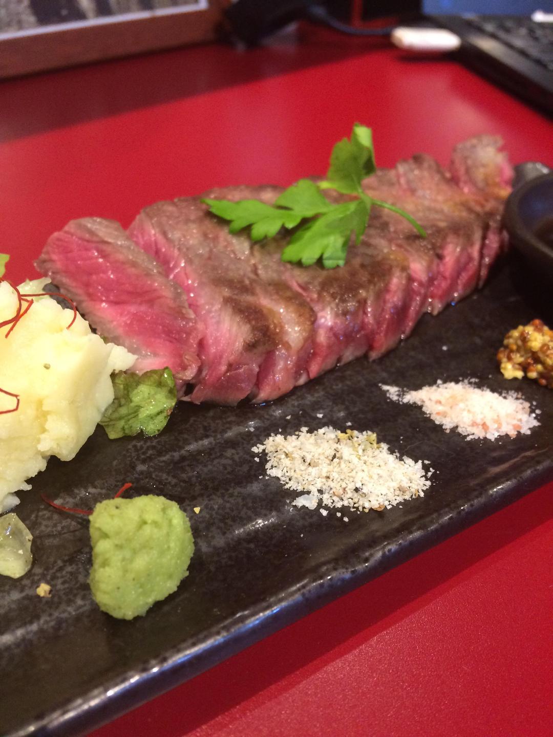 サーロインステーキの赤ワイン醤油の試作 賄いで試食 ワサビ・ハーブ塩・岩塩・マスタードとの相性も確認 マスタードは醤油と相性が良くないという事を感じました。 もしかするとマスタードが美味しいという人もいると思います。 正解はないですが色々楽しみながら経験を通し味覚の基準を作ってます。