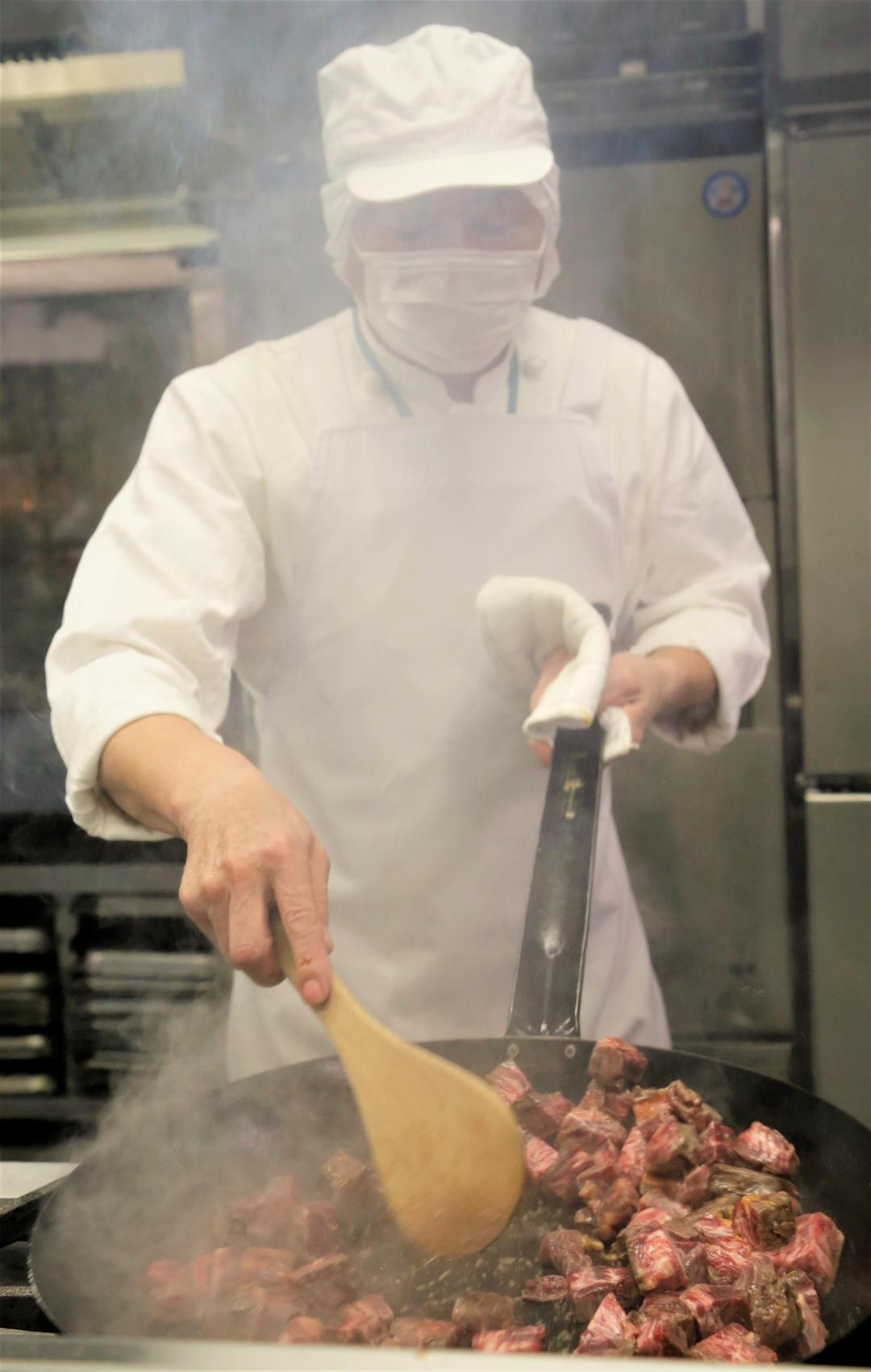 今日のメニューにはサイコロステーキが! 柔らかくておいしいステーキです? まかないでも同じものが出るので毎日のメニューが楽しみです♪