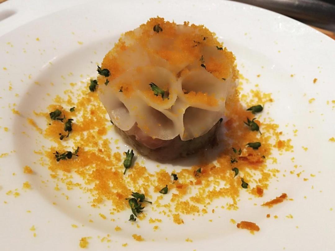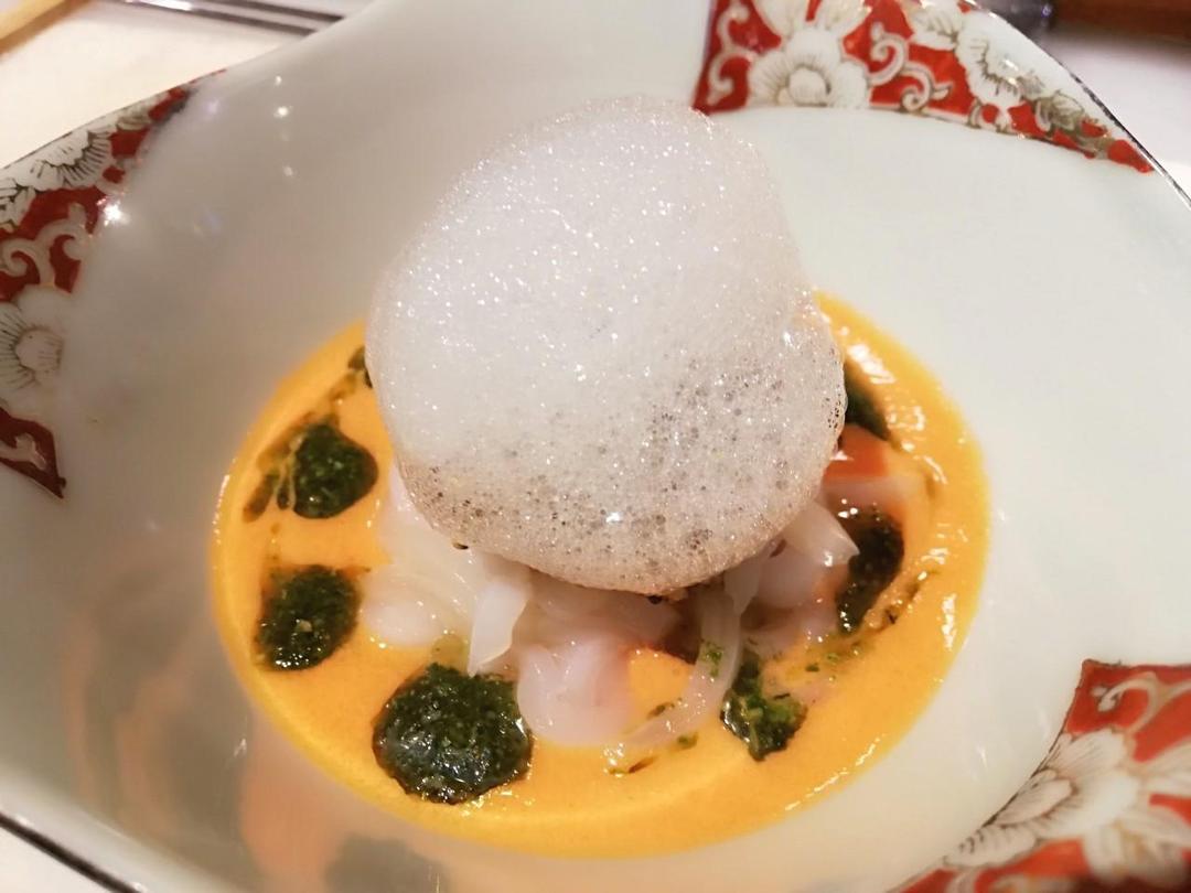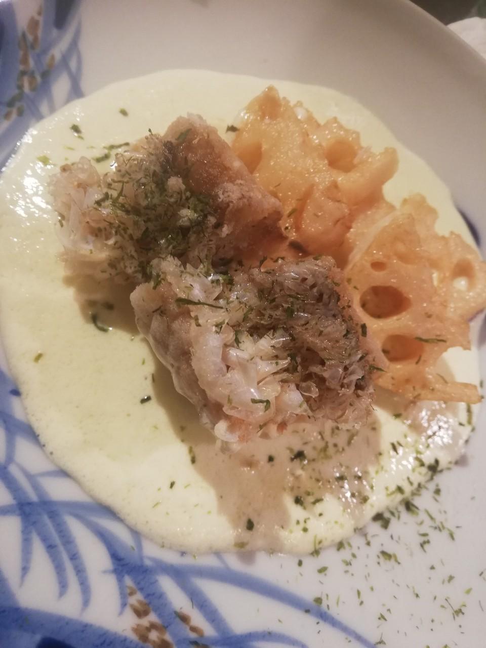 旬のアマダイ。鱗はパリ、さくっ。柚子かおるソースで。 シンプルに焼いても天ぷらでも。うまいけど。