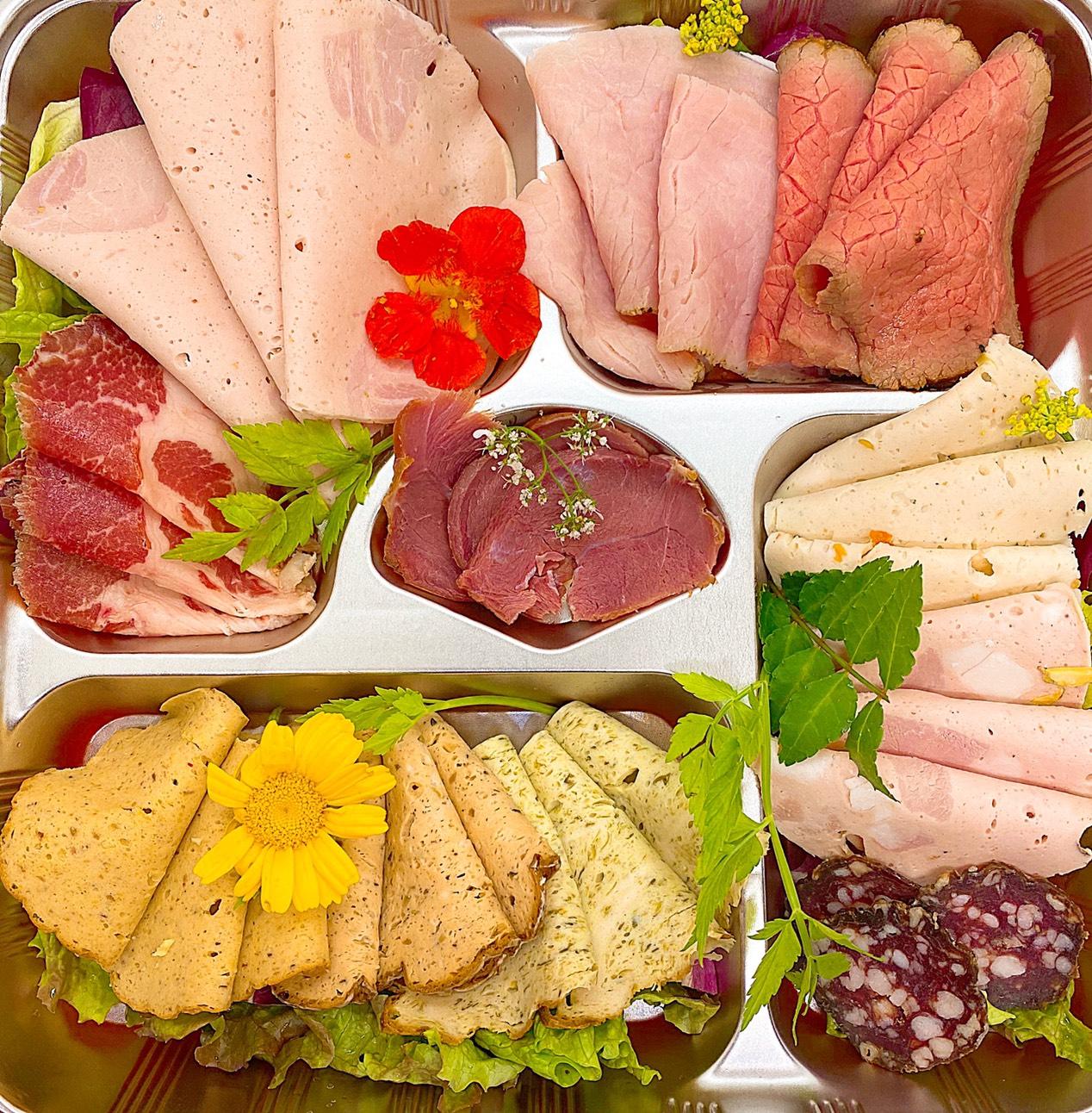 ◆三輪亭のハムとサラミの盛り合せ◆ これは、配送用のハムの盛り合せ。 配送用には、このようにして、プラ素材の容器に酒類を分けて入れ、窒素ガス入りの真空包装をして、お届けします。 スーパーなどで見かける、チーズのセットには、真空の袋に入っているようで、ふんわり空気も入っているように見えますよね。 そして、チーズなのに、熟成とかどうなっているのか、気になっていました(個人的に) それは、この窒素ガス注入真空包装でした! すごい! って思ったら、見に来てください。 真空包装する機械は割とどこでもあるかもしれませんが、 ガスまで持っている個人店はあるでしょうか。 ガス、あります。
