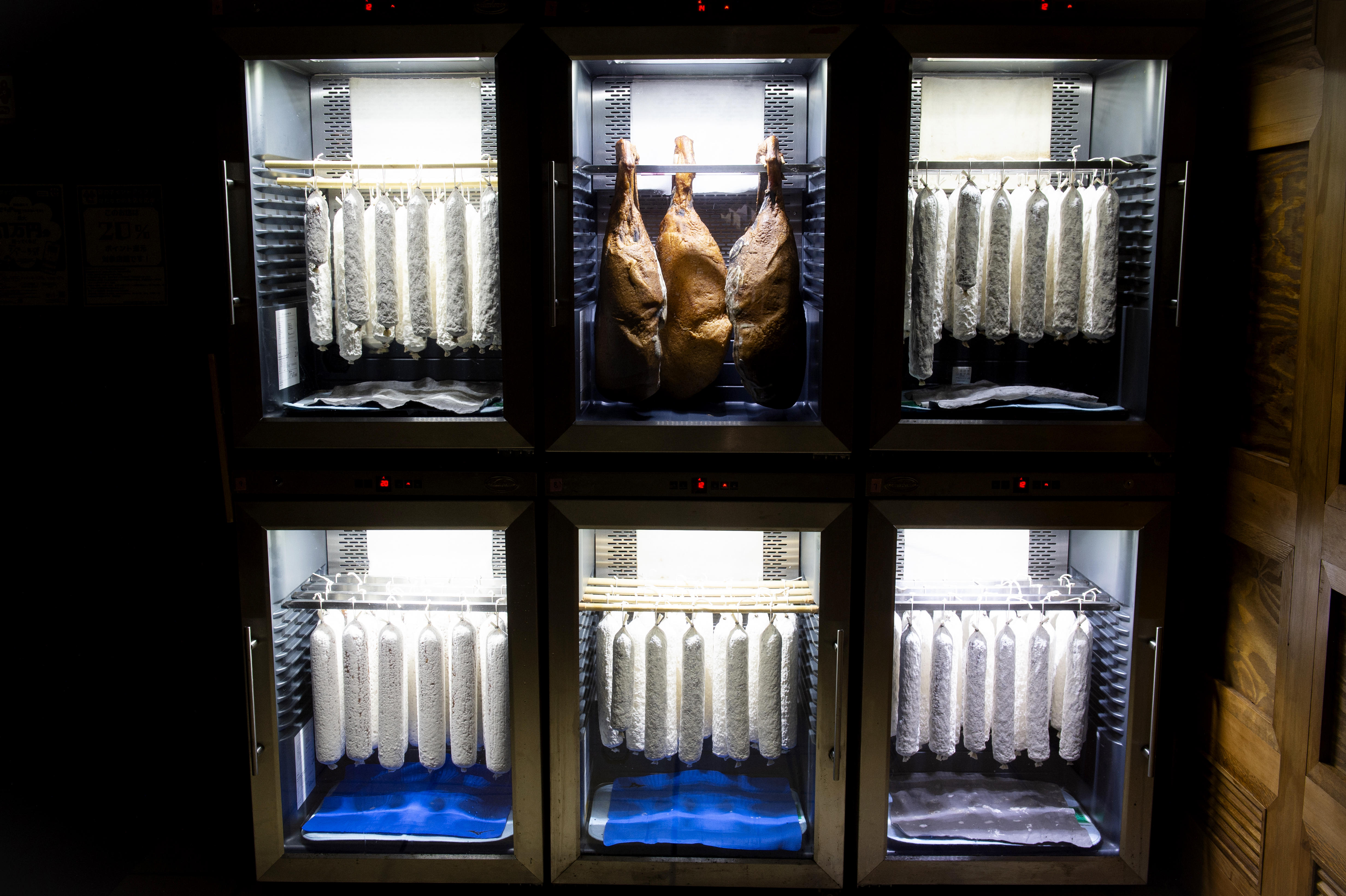 写真は、客席に設置したサラミやハムの熟成庫。 収穫を待つ白カビサラミと、静岡県伊豆の国市の天城黒豚の原木生ハムです。 サラミはこの大きさだと、2ヶ月ほどの熟成期間を要します。 原木は2年間。 肉を買って、吊るしておけばいいってものではありません。変な虫がつかないように、変な色のカビがつかないように、変なにおいが出ないように、温度管理、湿度管理、乾燥具合、いろいろとケア、チェックします。 子どもを育てるように、スタッフを育成するように。 食肉製品製造業とは、そんなこともします。
