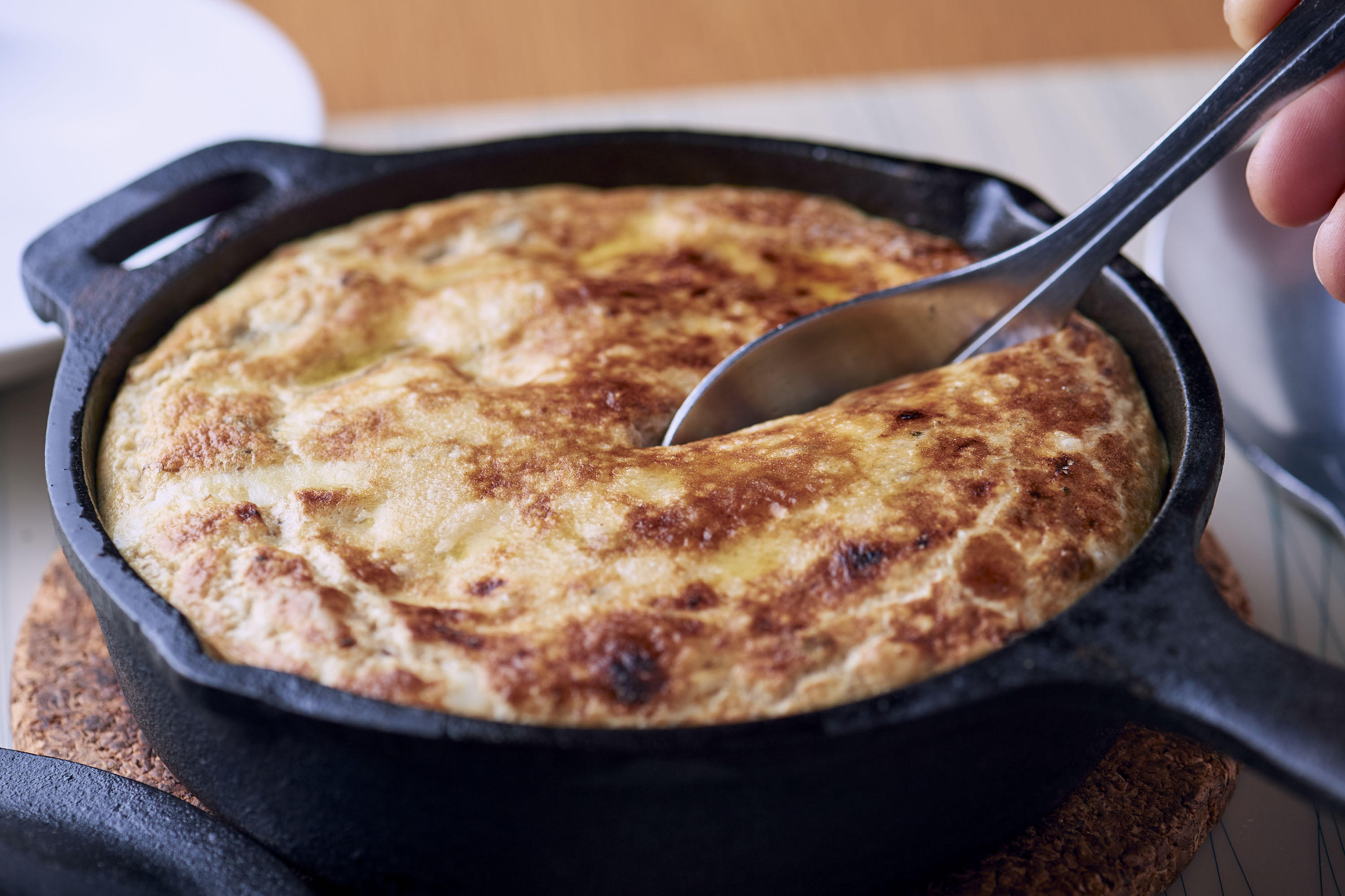 このお料理名は、「シュマーレン」と言います。三輪亭オリジナルのスフレ状のオムレツです。 ポルチーニ茸とチーズが入っていて、このスプーンを持ち上げると、チーズがのび~んってします。 もともとは、「カイザーシュマーレン」という、オーストリア等で食べられるデザートです。「カイザー」という名前からして、イタリアンではないことが明白です。この卵のデザートのしょっぱいものを、シェフが考案、お客様に好評をいただいております。 キノコ嫌いでなく、卵料理も食べられる方には、ぜひともお勧めしたいヒトシナです。 カイザーシュマーレンは、小麦粉を使用しますが、この三輪亭オリジナルのシュマーレンは、粉は使いません。ですから、すぐにアツアツの状態で食べないと、スフレはしぼんでしまいます。 一度ご賞味ください!