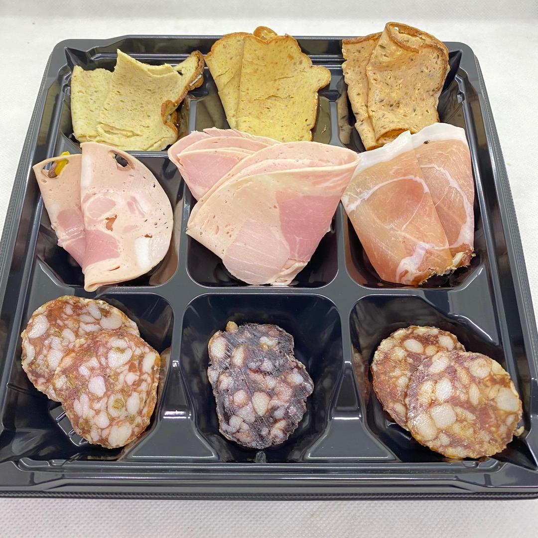 ~~自家製ハムとサラミの盛り合せ~~ これは、テイクアウト用に盛り付け↴写真です。 店内では、木を輪切りにした板に乗せて提供しています。 ハムやサラミは自家製で、白カビサラミは、香りをかぐだけでお腹がすきます。 生ハムや、コッパ、フライシュケーゼなど、色々肉加工品を作っています。 一度食べていただきたいです。