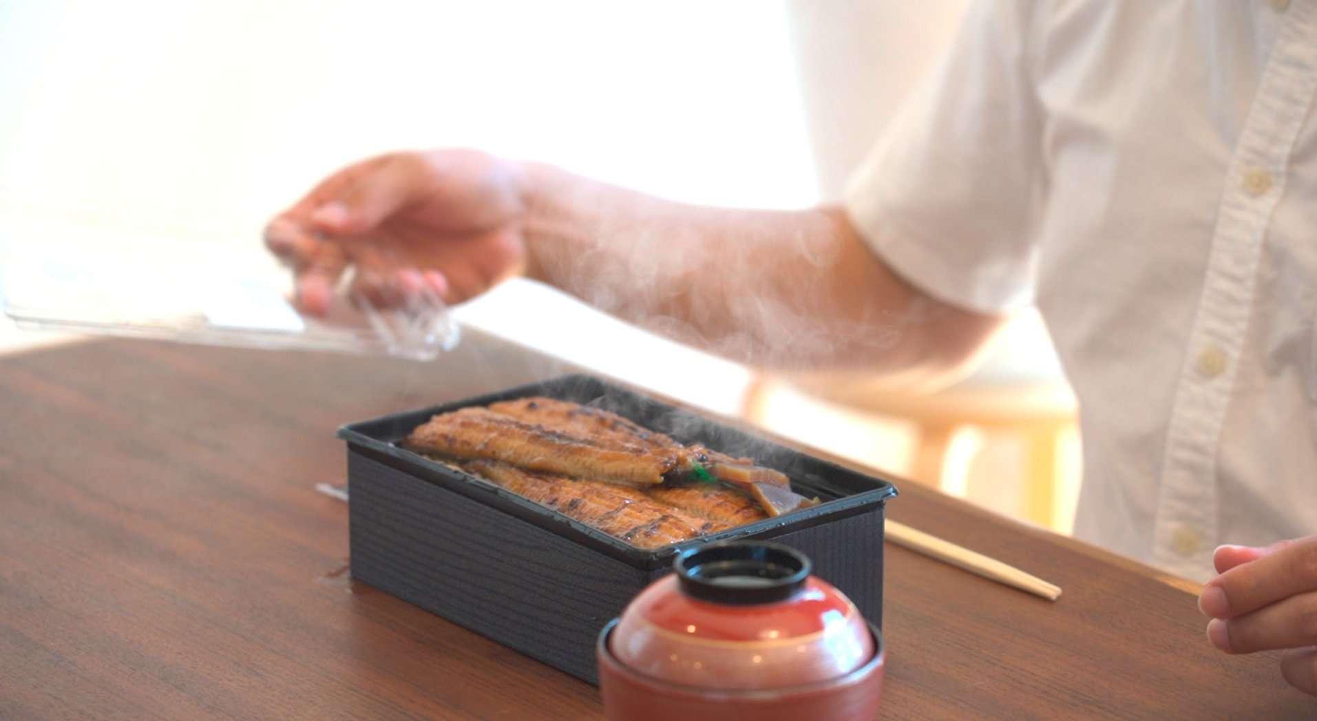 いつでもどこでもほっかほか! 当店のデリバリー弁当は紐をひっぱるだけでいつでもどこでもほかほかのうな重弁当がお召し上がり頂けます。 デリバリー弁当単店舗当たり売上日本一!!