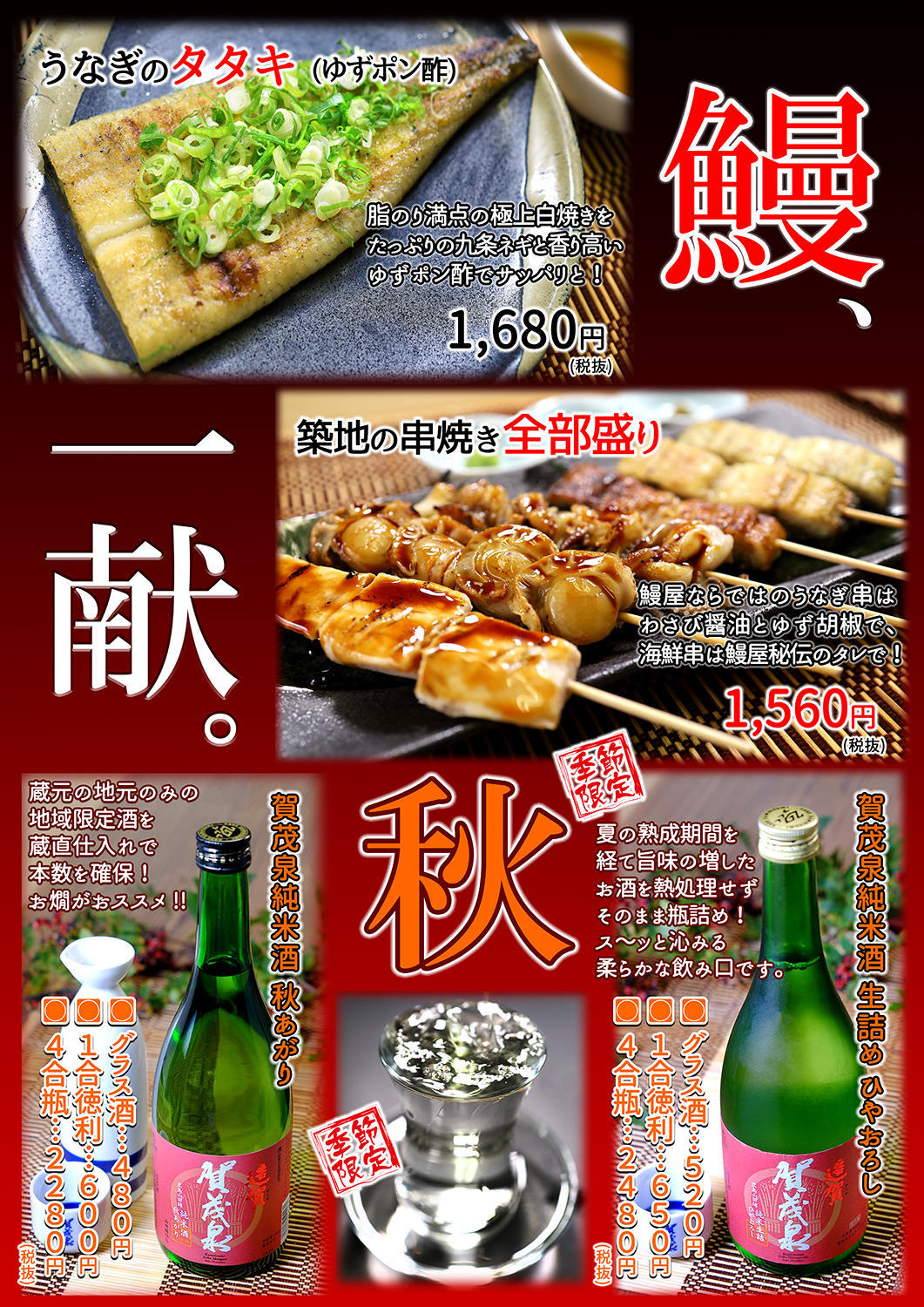 まだ若干暑い日もありますが大分涼しくなりましたね♪ 鈴虫も鳴いていて秋を感じる今日この頃です(笑) さてさて秋の訪れと共に今年も当店では秋酒をご用意いたしましたのでそのお知らせになります^^ こちらの秋あがりは春先から半年間土蔵でゆっくりと熟成され、程よく旨味ののった原酒を瓶詰めしています。 広島でしか卸さない秋の限定酒! 近所の酒屋さんでは、なかなか手に入らない西国のこの地酒を蔵元直入荷交渉で本数を確保しました!。 秋あがりならではの、旨さ漂う香りの良さ。醤油ベースの香ばしい鰻には、絶対おススメ!です。 秋季限定販売となりますのでこの機会に是非ご利用くださいませ!
