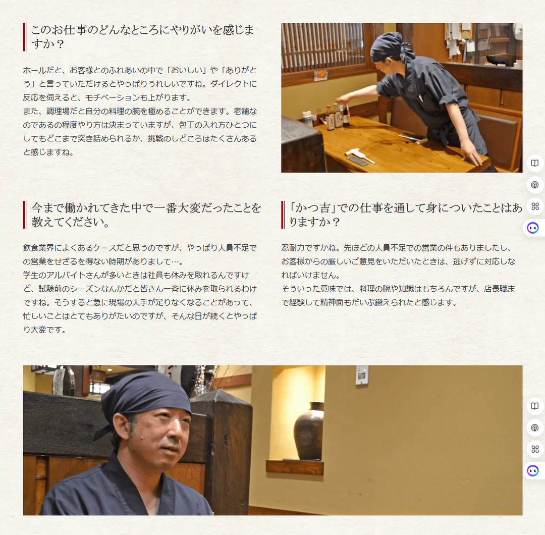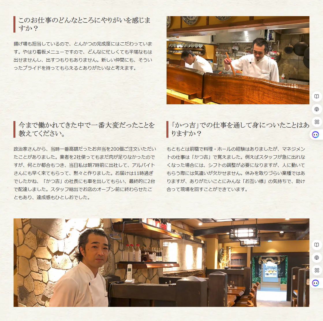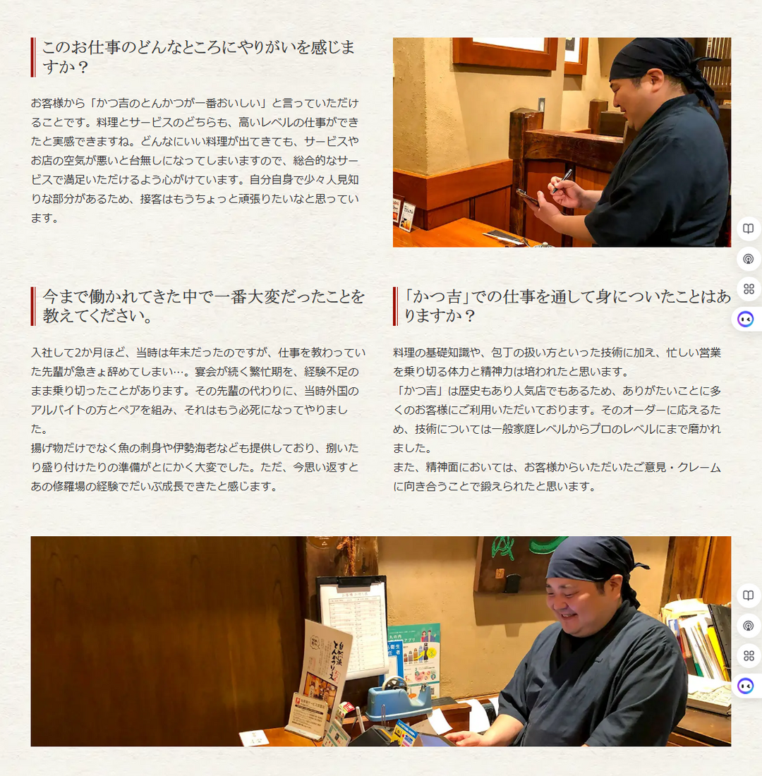 「仕事は好きだけど、 人間関係で悩みたくない。」 そんな方にこそ、見てほしいページがあります。 公式WEBサイトのスタッフ紹介では、 かつ吉で働く仲間たちが、 なぜこの店を選び、何を大切に働いているのかを本音で語っています。 やりがい、成長、失敗した話まで―― リアルな声だからこそ、 入社後のイメージが自然と湧いてくるはず。 職場の雰囲気は、文章より「人」が語ります。 ぜひ一度、のぞいてみてください。 https://www.bodaijyu.co.jp/recruit/interview/#staff03