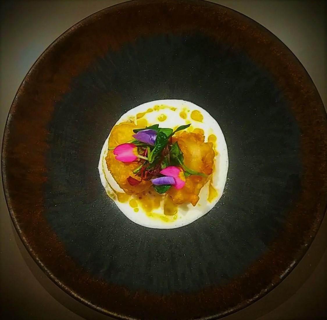 ~カンパチの包み揚げ ブッラータチーズの水~ シェフの様々なオリジナル料理を提供いたします。 メニュー構成は伝統的なローマ料理と各国で修業してきたエッセンスを 取り入れたイノベーティブな料理を間近で学ぶ事が出来ます。