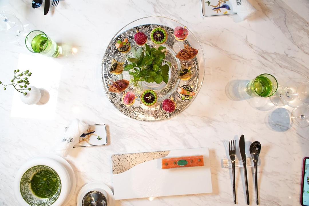 テーブル上で展開されるセイボリーコレクション。 フランスのエスプリと朝比奈シェフの美学を精巧な作りと鮮やかな色の組み合わせで再現します!