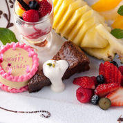 毎日1件はリクエストのあるバースデープレート! 30cm大のお皿にすごーい!と思わず声の上がるフルーツ&デザートの盛り合わせ。 特に仕掛け付きのケーキ型おもちゃには、キャーキャー盛り上がります!! その仕掛けは、ご自身でお確かめください(笑)