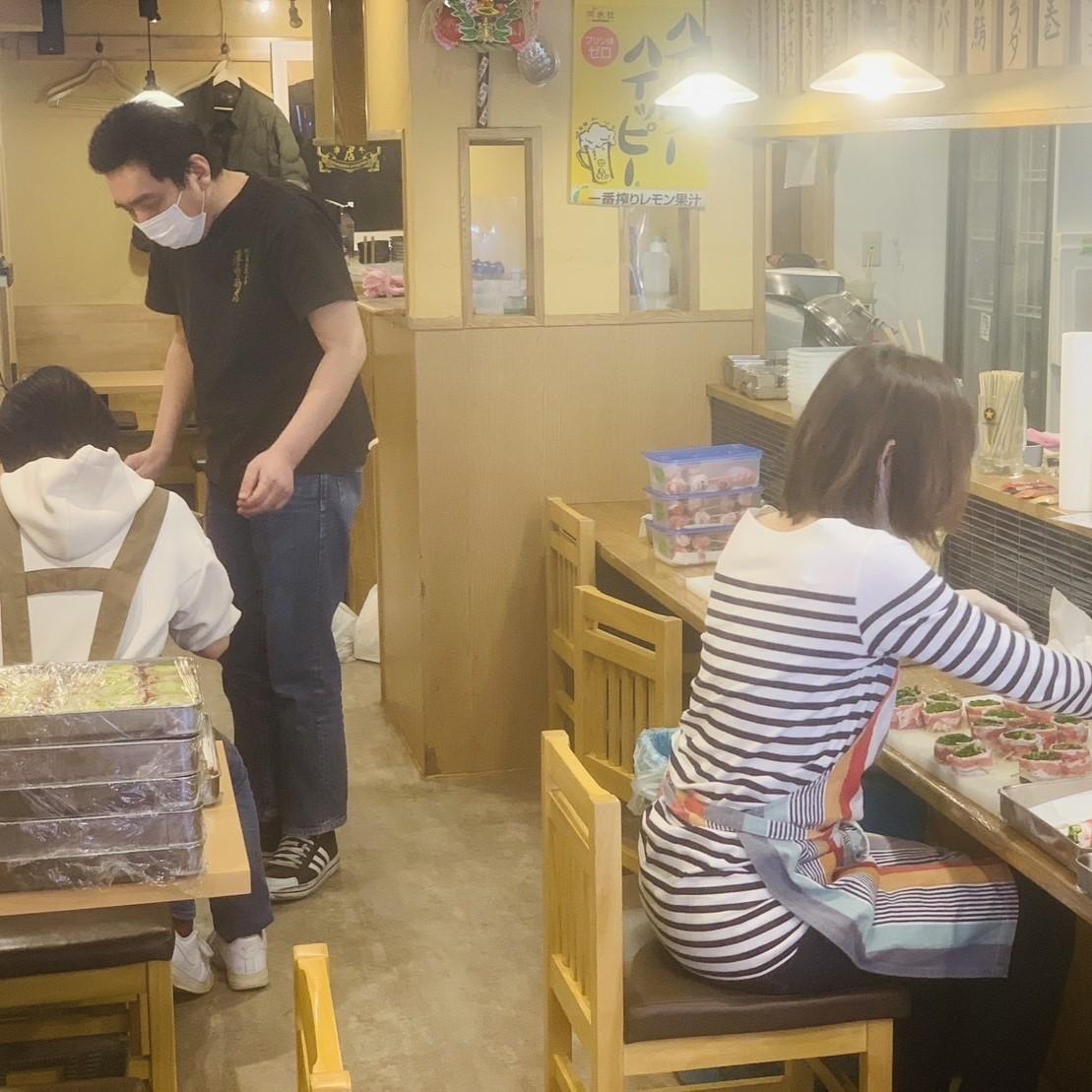 仕込風景 社員さん以外で串物を仕込むので、仕込みの負担が少ないです! 今後就労支援と掛け合わせた事業展開をするので、さらに利益を生みながら仕込みができる環境ができます。そうなれば従業員のみなさんへの還元も増やせます。