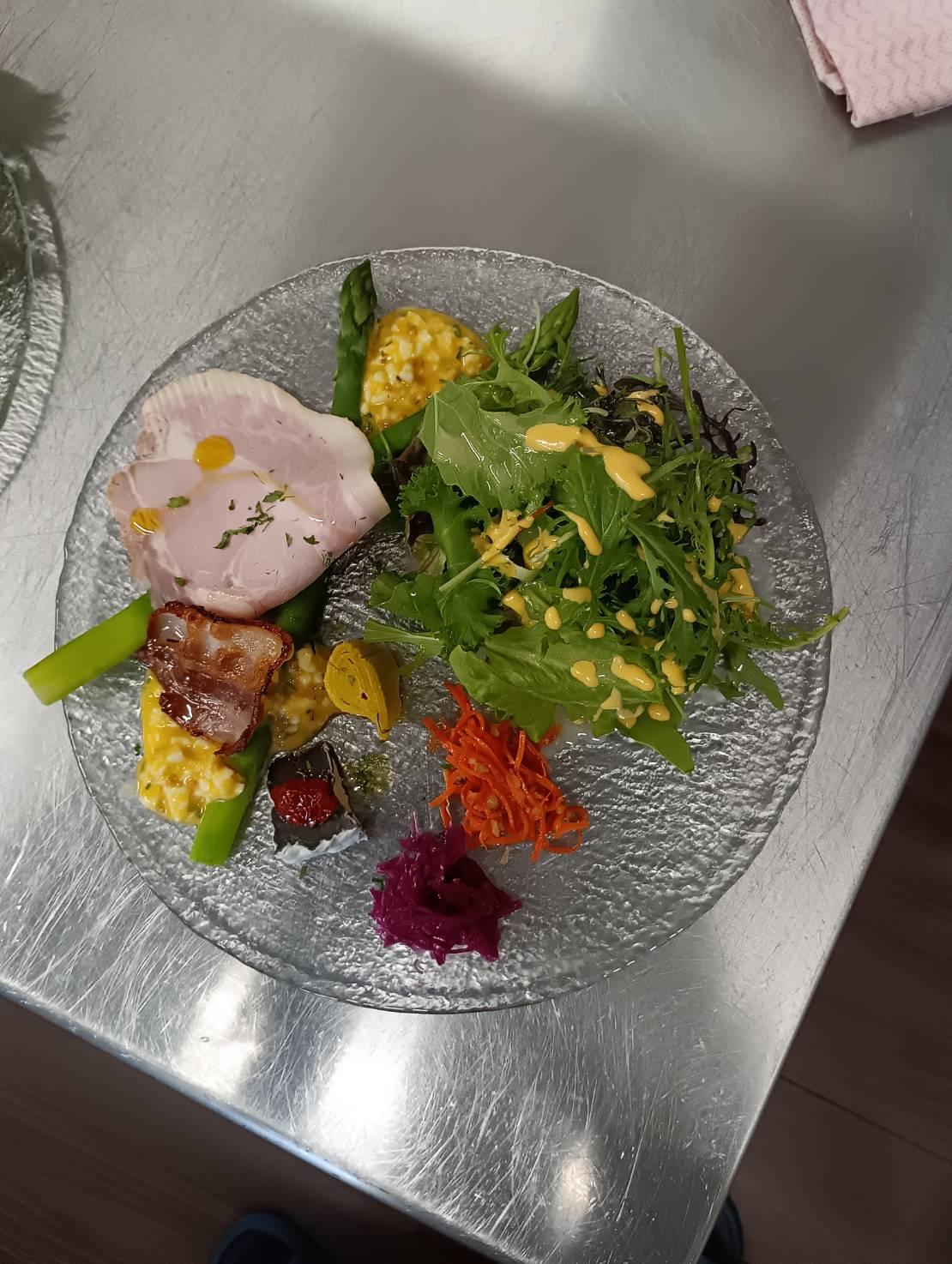 とある日の朝食でお出しした一皿。 自社生産の、朝一収穫したての太いアスパラに、自家製のハムとベーコン。 地域の野菜たちに、ふらのチーズも少し。 この一皿の他に、道産小麦やライ麦を使った自家製パンが3種類。自家製のジャムも添えて。 ふらの牛乳から作った自家製ヨーグルト。 自家製ブイヨンにポロ葱等を入れた暖かいスープ。 大変喜んで頂けました。