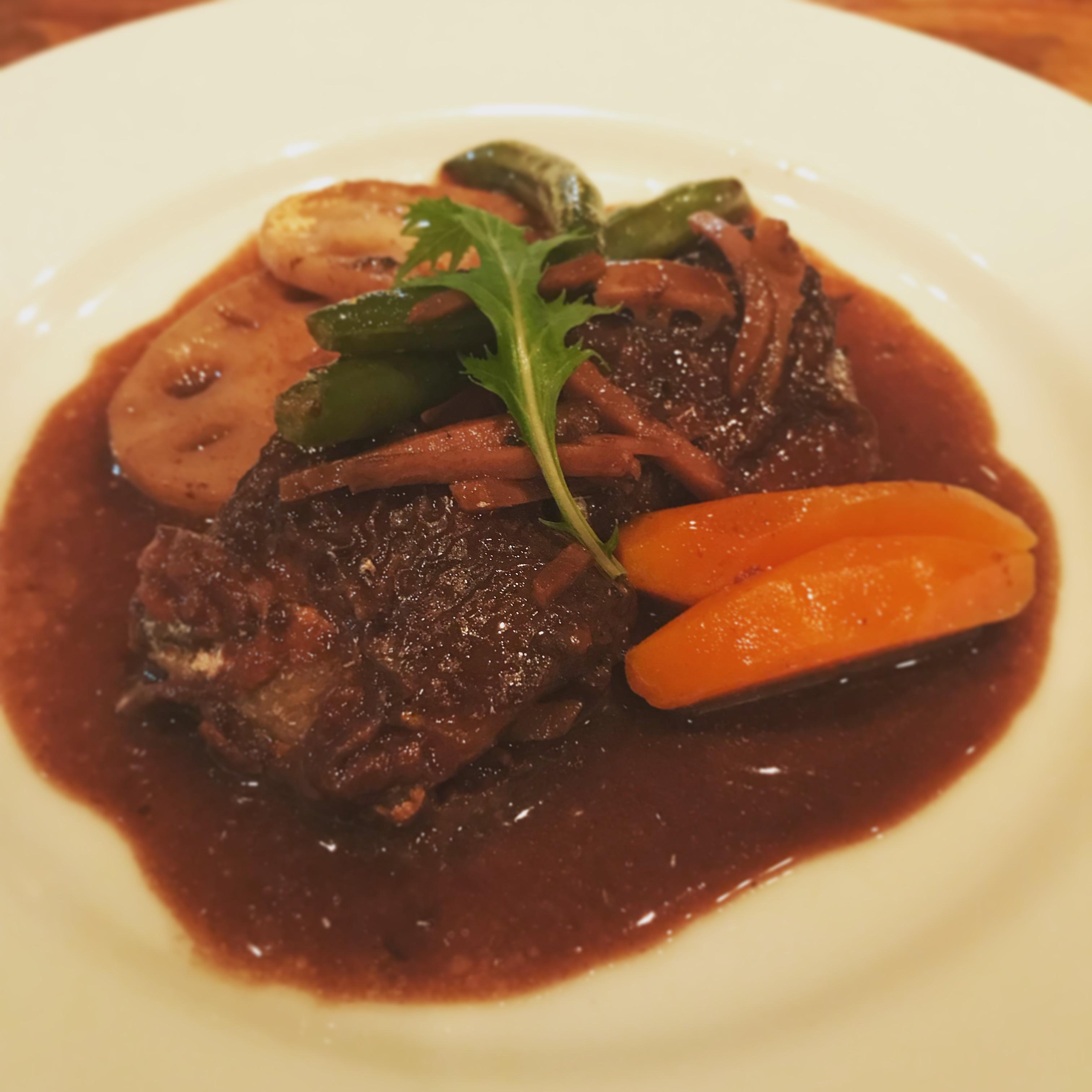 ☆秋刀魚と蓮根の赤ワイン煮 ¥680 この時期に安くて美味しい秋刀魚を赤ワインと醤油で煮込んで照り焼き風にしました。